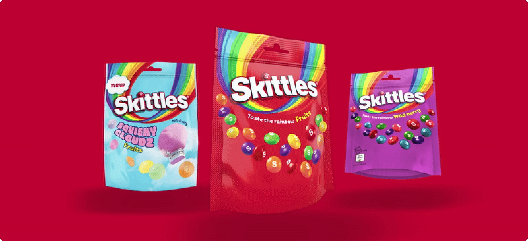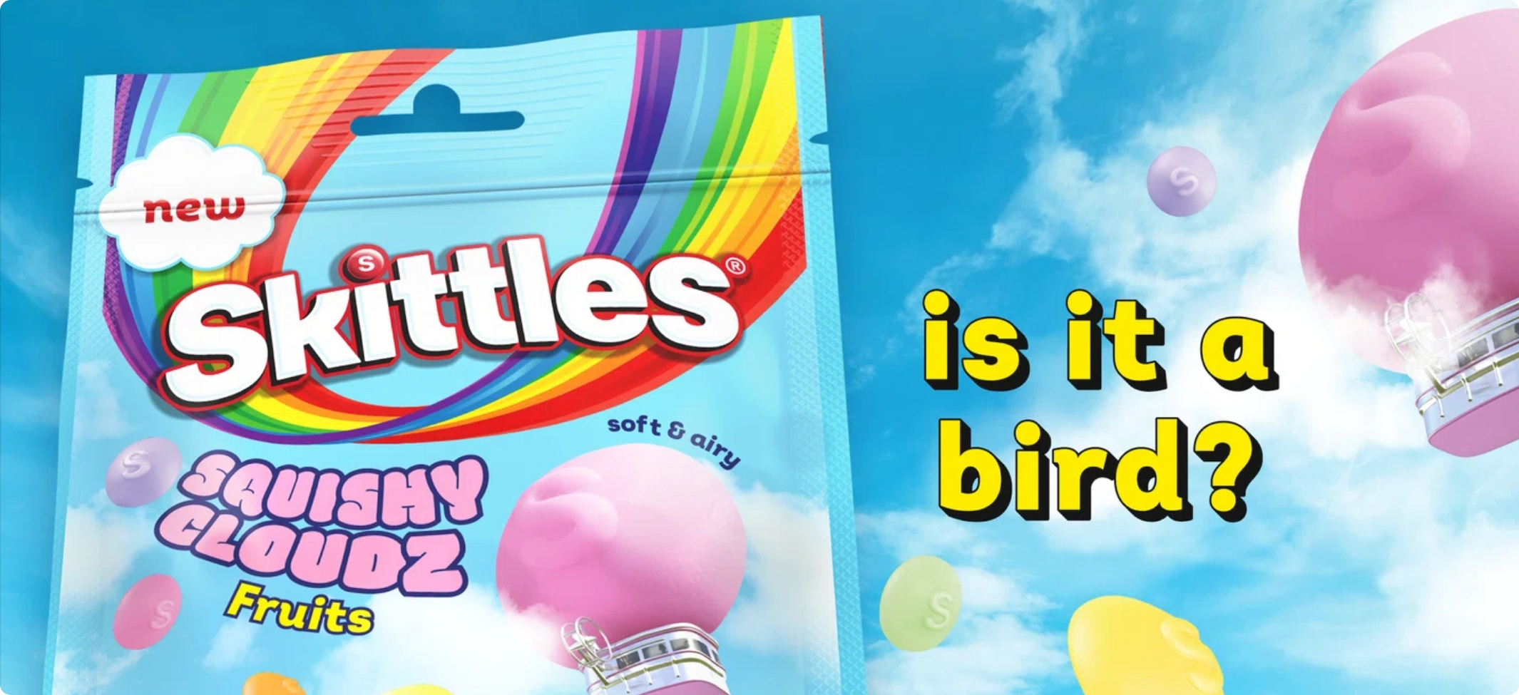 The refreshed typography includes a notable tweak, such as the slight kick on the ‘K,’ paired with a deeper shadow on the logo, which amplifies its presence among the brand’s new and quirky—yet unmistakably Skittles—features. This approach achieves two key objectives: it unifies the brand across its various ranges, like ‘Squishy Cloudz’ or ‘Wild Berry,’ and it allows the bold, amplified elements, such as the more vibrant rainbow and the scattered, flying lentil-shaped sweets and slogans, to stand out across different packaging.